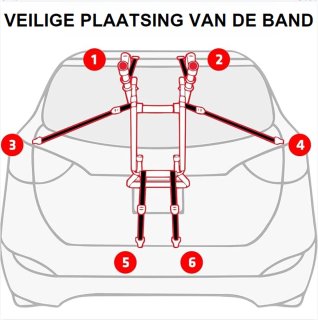 - Plaats de fietsen op de drager, zet de wielen vast met de verstelbare riemen en klem het frame stevig vast.